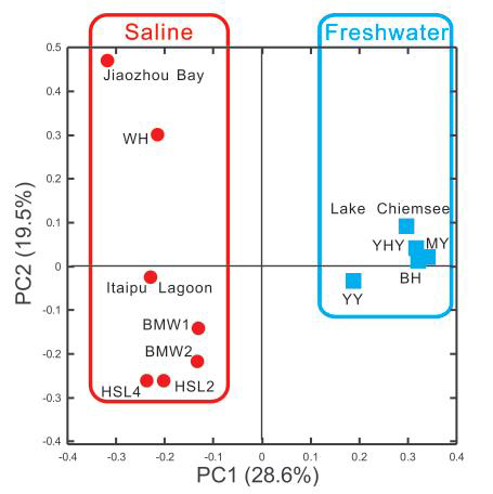 的微生物,它们在全球铁元素循环、铁矿物形成和沉积物天然剩磁中发挥重要作用。为了深入认识这类微生物的多样性和地理分布,中国科学院地质与地球物理研究所地球深部结构与过程研究室博士后林巍及其合作导师潘永信研究员等通过对我国北京、山东和海南等地淡水和咸水趋磁细菌的多样性系统研究,并结合与德国、巴西等已有趋磁细菌DNA序列进行系统发育比较和统计分析,首次发现了趋磁细菌在全球范围具有一定的地理格局分布,这种分布与趋磁细菌生活的水体盐度呈显著相关
